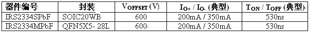 IRS2334SPbF 采用 SOIC20WB 封裝,而 IRS2334MPbF 則以 QFN5X5 封裝供貨,占位面積只有25 mm2 ,并按照合適的爬電與間隙距離要求來(lái)設(shè)計(jì),確保產(chǎn)品堅(jiān)固可靠,電壓可高達(dá)600V。