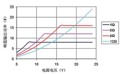 D 類放大器MOSFET輸出級的導通電阻會影響它的效率和峰值電流能力。降低負載的峰值電流可減少MOSFET的I2R損耗,進而提高效率。要降低峰值電流,應在保證輸出功率, D類放大器的電壓擺幅以及電源電壓的限制的條件下,選擇最大阻抗的揚聲器,如圖4所示。本例中,假設D類放大器的輸出電流為2A,電源電壓范圍為 5~24V。電源電壓大于等于8V時,4Ω的負載電流將達到2A,相應的最大連續輸出功率為8W。如果8W的輸出功率能滿足要求,則可以考慮使用一個 12Ω揚聲器和15V供電電壓,此時的峰值電流限制在1.25A,對應的最大連續輸出功率為9.4W。此外,12Ω負載的工作效率要比4Ω負載的高出 10%~15%。實際效率的提高根據不同D類放大器而異。雖然大多數揚聲器的阻抗都采用4Ω或8Ω,但也可采用其他阻抗的揚聲器實現更高效的散熱。