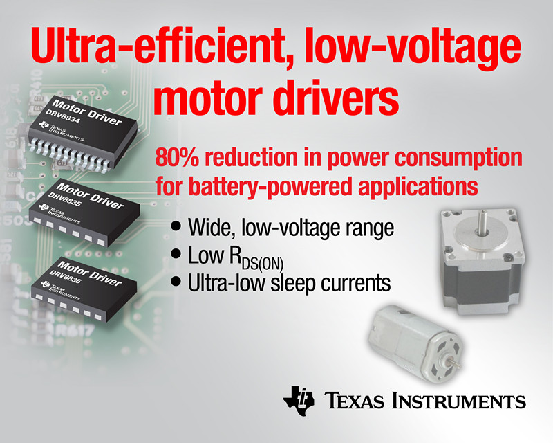 日前,德州儀器 (TI) 宣布推出 3 款面向有刷 DC 及步進電機的最新低電壓器件,進一步壯大其不斷豐富的高集成 DRV8x 電機驅(qū)動器產(chǎn)品陣營。該 DRV8834、DRV8835 以及 DRV8836 電機驅(qū)動器支持寬泛的低電壓工作范圍、低 RDS(ON) 與超低睡眠狀態(tài)電流,與性能最接近的競爭產(chǎn)品相比,功耗銳降達 80%,可延長電池使用壽命,改進散熱性能,提高系統(tǒng)可靠性。此外,這些高集成器件還采用超小型封裝,與分立式解決方案相比,可將板級空間銳減達 95%。