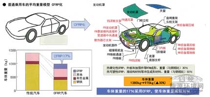 例如,按照碳纖維協會的推算,普通乘用車的平均車體重量為1380kg,如果盡可能采用CFRP部件,重量大約可以減輕30%,達到97Okg。CFRP的使用量占車體重量的17%左右,約為165kg,這樣一來,如果10年的行駛距離為9.4萬km,二氧化碳排放量可以減少5噸。