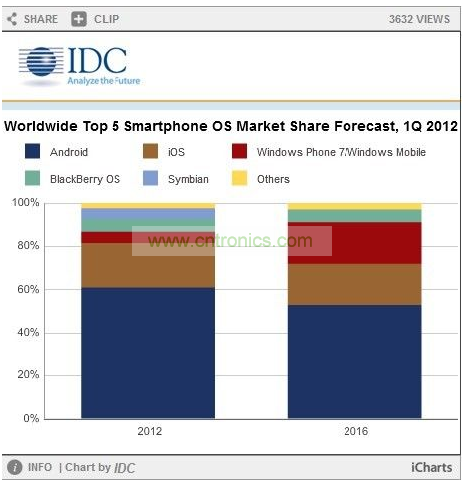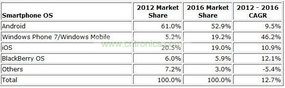 下表反映了IDC對2012年和2016年全球智能手機操作系統所占市場份額以及2012到2016年之間復合年增長率的預期: