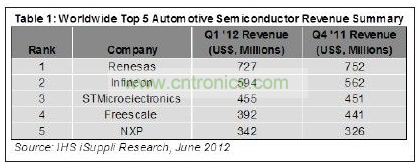 瑞薩電子的汽車半導(dǎo)體營業(yè)收入為7.27億美元,遙遙領(lǐng)先于其它競爭對(duì)手。排在其后的廠商是德國英飛凌、法國-意大利企業(yè)意法半導(dǎo)體、美國飛思卡爾半導(dǎo)體和荷蘭恩智浦半導(dǎo)體,如表1所示。