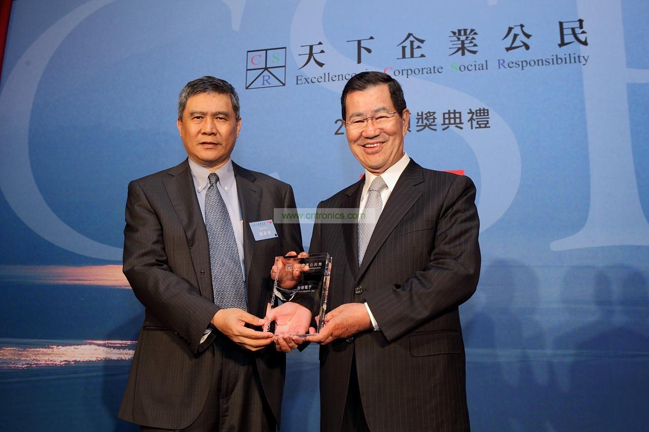 臺(tái)達(dá)電子海英俊董事長(左)出席2012 天下雜誌企業(yè)公民獎(jiǎng)?lì)C獎(jiǎng)典禮, 自 蕭萬長前副總統(tǒng)手中接過大型企業(yè) 首獎(jiǎng)