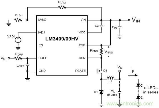 圖4所示的LM3409/09HV控制降壓電路,是功率LED驅動器中最常用的電路模式。圖5中的LM3424可以作為升壓穩壓器LED驅動器,也可以作為降壓/升壓、SEPIC(單端主電感轉換器)、反激式甚至是‘’懸浮‘’降壓電路。