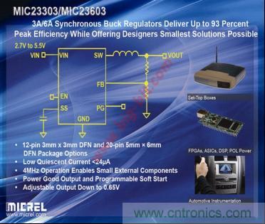 麥瑞半導體推出了采用HyperLight(R)Load技術(shù)的4MHz PWM 6A/3A同步降壓穩(wěn)壓器系列產(chǎn)品MIC23603/303。MIC23603/303采用的專利架構(gòu)提供了最高水準的瞬態(tài)性能,在全脈寬調(diào)制(PWM)模式下輸出紋波僅有5mV。MIC23603/303將低損耗的專利功率MOSFET與麥瑞半導體擁有專利的恒定導通時間直流-直流開關(guān)轉(zhuǎn)換器方案結(jié)合在一起,可提供高達6A/3A的輸出電流,同時僅消耗24μA靜態(tài)電流。MIC23603/303是驅(qū)動機頂盒、便攜式設(shè)備以及汽車儀表中的FPGA、ASIC和DSP集成電路的理想產(chǎn)品,在這些應用中,超快瞬態(tài)響應和輕載效率至關(guān)重要。MIC23603目前已經(jīng)開始批量供應,千片訂量的價格為1.08美元/片。MIC23603的千片訂量價格為0.49美元/片。