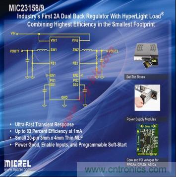 麥瑞半導體推出了兩款3MHz雙輸出2A高效降壓穩(wěn)壓器MIC23158/9。得益于麥瑞半導體擁有專利的HyperLight Load®技術(shù),這兩款集成電路為當今最苛刻的應用提供了超快的瞬態(tài)響應,包括機頂盒、針對FPGA的核心和I/O電壓、CPLD、ASIC、GPS/導航系統(tǒng)、PC卡、汽車儀表以及通用負載點(POL)直流-直流轉(zhuǎn)換等應用。MIC23158/9目前已經(jīng)開始批量供應,千片訂量的價格分別為0.88美元/片和0.91美元/片。