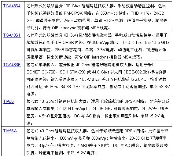 TriQuint五款新型跨阻抗放大器,擴(kuò)展光纖市場