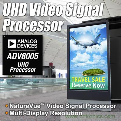Analog Devices, Inc.(NASDAQ:ADI)最近推出一款超高清(UHD)視頻信號處理器,這款處理器可以在SD (480i)、ED (480p)、HD(720p、1080i和1080p)以及UHD (2160p)等視頻格式之間進行上下轉換。UHD NatureVue™ ADV8005視頻信號處理器 可為兩個同步視頻流提供多種屏幕分辨率,適用范圍十分廣泛,從A/V接收器和HDMI分頻器到商業視頻分發系統和數字標牌。這款新型處理器可以在內部產生高質量的位圖式屏幕顯示(OSD),允許設計師輕松集成滾動文本和動畫等功能,色深最高可達24位真彩色。同時還可接受來自外部源(如圖形處理裝置)的OSD信息。