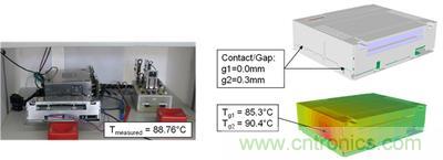 底盤的一部分被用作汽車功放的冷卻散熱片。底盤的一個重要方面在于頂部支架和底蓋的熱接觸程度(關乎制造公差)。對模型假設進行驗證是提高模型精確度的關鍵。這樣可以測量產(chǎn)品原型并利用測量結果來比較模擬模型。方案1 (g1) 無間隙(完全熱接觸),而方案2(g2) 則存在0.3毫米的間隙,因此蓋子之間沒有熱接觸。通過比較所測量的外殼溫度,方案2(有間隙)似乎最能代表支架的接觸程度。