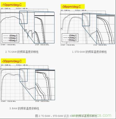 TC-SAW、STD-SAW以及BAW的頻率溫度依賴性的比較