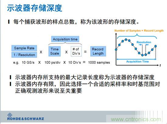 當(dāng)我們測量一個(gè)信號,在不同采樣情況之下,采樣的結(jié)果誤差特別大。采樣率不夠,就是你帶寬不夠,看到的是上面的濾波的效果,所以我們要時(shí)刻提出采樣率,對于采樣率而言非常著名人提出的定理,這個(gè)老先生告訴我們,采樣率是信號的兩倍,才能保證你的信號的準(zhǔn)確率。采樣率決定捕獲信號的時(shí)間分辨率,時(shí)間分辨率越高,可以察看的波形細(xì)節(jié)越多,但可以捕獲的時(shí)間窗口會下降。我的個(gè)人經(jīng)歷是取決于你想要采集什么樣的信號,采集到什么程度。如果我測量的是發(fā)波,我就要看它的周期,你的采樣率是6個(gè)點(diǎn),可能誤差只有1%。我們希望我們采的信號,感興趣的細(xì)節(jié)可以采到3到5個(gè)點(diǎn),最好是5個(gè)點(diǎn),當(dāng)然采更多點(diǎn)的意義就不大了。為什么采更多點(diǎn)意義不大呢?因?yàn)椴蓸勇食瞬蓸訒r(shí)間,等于示波器的產(chǎn)品的深度,產(chǎn)品太大了,會消耗你很多的時(shí)間,單位時(shí)間采的點(diǎn)太多,這個(gè)波形時(shí)間就太短,所以一般建議采到3到5個(gè)點(diǎn)。