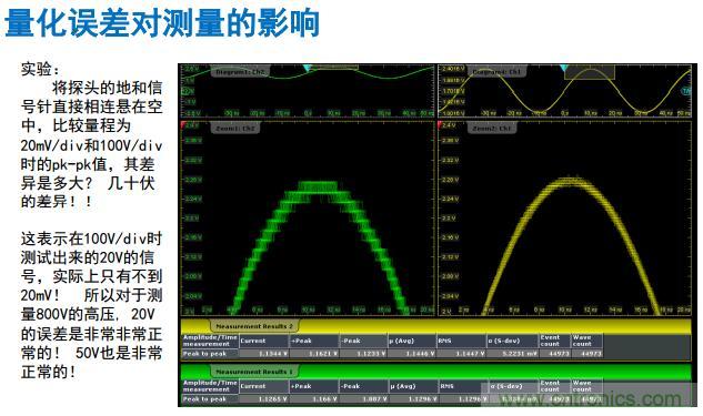 很多人覺得不可思議,為什么零伏的測試信號是30伏呢?就是這個(gè)原因。因?yàn)榘雽?dǎo)體的制作工藝的原因就是這里。當(dāng)100伏/格的時(shí)候,正常測量的范圍是800伏除以256,最終結(jié)果差不多是30。這個(gè)是高壓測量的例子。所以平時(shí)用示波器測量電源的文波的時(shí)候,我們應(yīng)該怎么做?如果是測量3.3伏的電流波,永遠(yuǎn)要把探頭在地上的帽子拔掉,這個(gè)用短的地環(huán)。如果測1.8伏以下的電流波,紋波只有3豪伏以下的時(shí)候怎么做?勇敢要把探頭拔掉。為什么?因?yàn)楹芏嗵筋^插上去之后,最小是1毫伏/格,直接就變成了10毫伏/格,你的示波器的量化、噪聲,加上隨機(jī)噪聲,遠(yuǎn)遠(yuǎn)的大于你的被測信號的噪聲,測量的結(jié)果就失去意義了。所以我們講的第一個(gè)原則就是量化最小測量誤差。