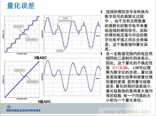 我們復(fù)習(xí)一下示波器的基本原理,把模擬信號變成影響點(diǎn)的各個(gè)。在數(shù)字空間里,永遠(yuǎn)都有0和1,每一個(gè)0和1代表的電壓的大小是多少呢?通常是8位的0和1組成一個(gè)電壓。電阻里的電源的電壓是400伏,還是低壓5毫伏,都可以進(jìn)行量化。每一個(gè)0和1代表的電壓是多少呢?這個(gè)是最小有利的比特位。特殊講,就是示波器的每一個(gè)路徑,示波器乘1111111,變成了11111110,最后一位從1變成0的跳變,代表了電壓的大小是多少呢?是取決于平時(shí)用示波級的量程。如果示波器1伏每格的時(shí)候,你0和1的跳變大約是30毫伏的變化。這個(gè)是示波器外邊的電壓的變化,30毫伏的電壓對示波器是沒有影響的,示波器感覺不到。這個(gè)就像平時(shí)用1厘米的刻度尺來測量頭發(fā)的時(shí)候發(fā)現(xiàn)無法測量,這個(gè)是基本的道理。