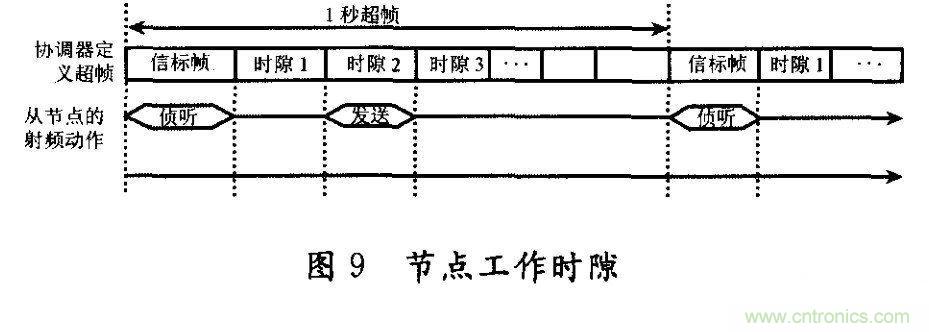 為 了滿足應用要求,網絡協調器設定1s的超幀(superframezT_sfc-=Is)周期,每個傳感節點有保留的50ms時隙(timeslot), 來傳輸數據,如圖9所示。超幀周期以網絡協調器發送的信標消息(bea—conmessage)起始,信標消息含有時間同步信息。每個傳感器節點在下一個 預期的信標到來前,才喚醒它的射頻接口為接收模式。顯然,在TDMA時隙幀結構工作模式下,系統的時間同步要求較高,需要設計專門的時間同步協議。
