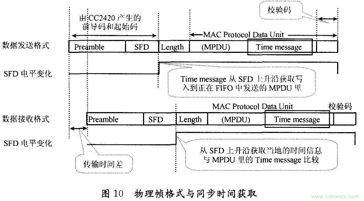 在 如圖1中,主節點(協調器)作為標準時間源,應該注意,當時間產生并加入到消息中時,該消息已經開始發送了。當一個信標幀被發送時,處理器把整個幀載人發 送FIFO,接著使能發送。然而,信標幀必定包含該幀開始發送后產生的時間。因此,在主節點發送信標幀的過程中,當產生SFD中斷時,就提取出捕獲計時器 值并轉換成全局時間。該全局時間通過RAM(隨機)的讀寫方式插入到正在發送的FIFO發送隊列中。這個過程必須足夠快地完成,以保證整個信標幀正確發 送。如果處理太慢,發送FIFO會向下溢出,發送消息失敗。