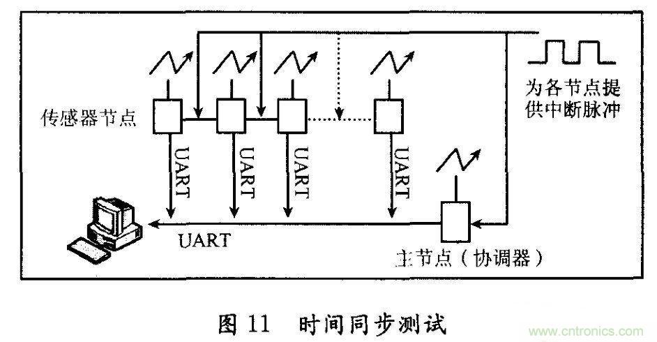 能力的數字I/0端口。每次當公共信號狀態改變時,所有節點各自報告它們的全局時間信息。通過比較主處理器與從節點的時間信息,可確定從節點時間的絕對誤差,從而修正同步精度。
