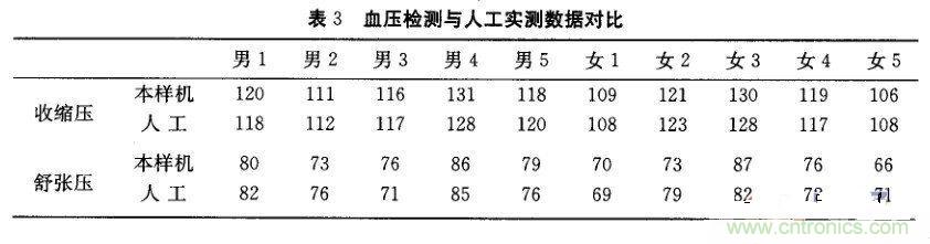 表3給出了本監護設備樣機檢測與人工實測血壓數據的比較。通過線性回歸一致性分析,本樣機和人工測算的收縮壓相關系數p=0.9749,舒張壓相關系數p=0.8166,一致性較好。