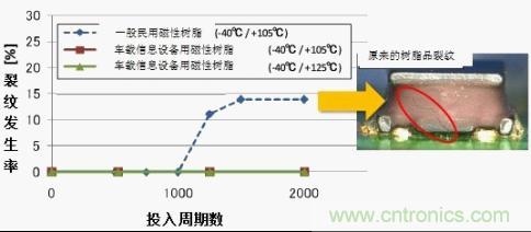 熱沖擊試驗投入的循環數和開裂發生率的關系如圖3所示。可以得知,與面向一般民用市場的磁性樹脂在1000次循環試驗以內會發生開裂相比,我們開發出的用于車載信息設備的磁性樹脂在2000次循環之后仍未發生開裂現象。并且,已經確認在更為嚴酷的環境下---40℃↔+125℃中進行的熱沖擊試驗也沒有發生開裂現象。