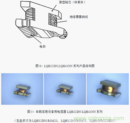 LQH32DN、LQH43NN系列是為了適應大電感值領域的車載電感市場的需求所設計的,它的最高使用環境溫度可達105℃,是一種無磁性樹脂型的繞線電感器。為了降低由于鼓型磁芯開裂及絕緣覆膜銅線的熱膨脹收縮引起的斷線風險,因而采用了無樹脂結構。結構概略圖如圖4,產品照片如圖5所示。