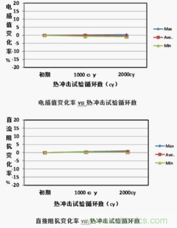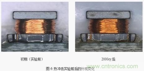 圖6、7所示為關于LQH43NN222K03在-40℃↔+105℃/2000循環熱沖擊試驗前后的外觀照片,主要電氣特性的變化。在熱沖擊試驗后,沒有發現鼓形磁芯的開裂及電線斷線等不合格現象。另外,關于主要的電氣特性,變化率也控制在±1%以內,是滿足了車載用元器件性能要求的產品。