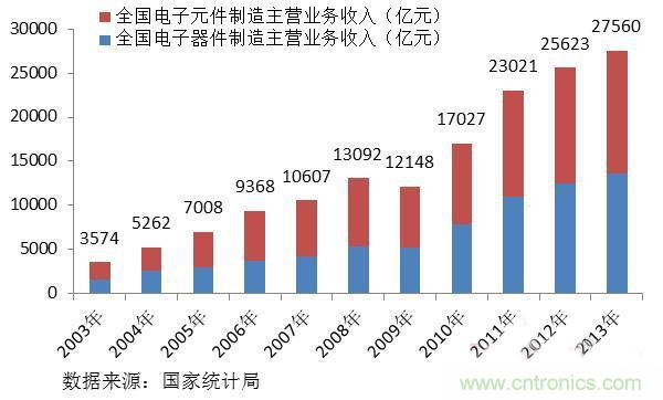 電子元器件是我國電子信息產(chǎn)業(yè)中的重要門類,產(chǎn)值比重約占電子信息產(chǎn)業(yè)的五分之一。2003-2013年,我國電子元器件行業(yè)增速迅猛,年復合增長達到了22.7%,從2003年的3574億元增長到2013年的2.76萬億元。其中,2013年電子器件制造和電子元件制造主營業(yè)務(wù)收入分別達到1.39萬億和1.36萬億元。