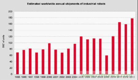 根據國際機器人聯盟(IFR)2014年統計顯示,2013年機器人出貨量增長12%,成長至178,132臺,如圖1所示,工業機器人持續在汽車、化工、橡膠、塑料等行業以及食品行業增加;2008年至2013年,中國的工業機器人每年總供應量平均增加36%,并且可促使該國成為世界最大的機器人市場。