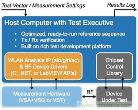 典型的非信令WLAN測試系統通過一個主機進行控制,主機運行的測試執行程序可讀取文件的測試矢量和測量設置、運行所需的測試,并將結果寫入日志文件或數據庫。測試執行程序調用應用程序編程接口(API)來控制測試儀器,這些測試儀器通常包括一個或多個矢量信號分析儀、矢量信號發生器或者矢量信號收發儀。此外,測試執行程序還通過調用WLAN測量算法來對所采集的數據進行測量。