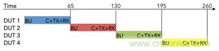 利用多線程并行軟件架構和外部開關電路,已經完成啟動的DUT在執行TX和RX測試時,并行軟件線程可控驅動下一個DUT的啟動過程,從而實現測試的流水線執行。這種方法減少了儀器的停機時間,縮短了高達35%的測試時間,如圖4所示。