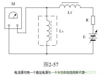 這里順便說明,采用圖2-54測試時應(yīng)該注意的地方。圖2-54中,隔離電感LT的大小要求是測試電感Lx數(shù)值的3倍以上,并且測量高壓包初級線圈的初始電感值L0時,最好也要接入電路之中。這里,隔離電感LT可選取20毫亨以上的帶矽鋼片鐵芯的電感,電感的鐵芯要留有一定的氣隙;電流源可用一個穩(wěn)壓電源與一個大功率電阻串聯(lián)代替,如圖2-57;或用一個穩(wěn)壓電源與一個大功率晶體放大器串聯(lián)來代替,如圖2-58。