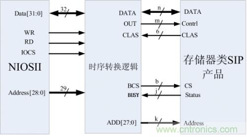 如圖4-2,SRAM、MRAM和NOR FLASH的接口操作基本一致,NIOSII的總線時序完全滿足。故在FPGA內部只要簡單的把相應的控制線和數據線相連就可以了,唯獨只要設計一個片選寄存器,用來區分SIP的16個片選。每一個片選可以訪問的空間為128MByte。片選寄存器的地址為(基址+0x0FFFFFFC),基地址設在NIOSII 外部總線的最高地址位。