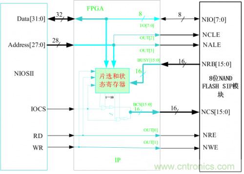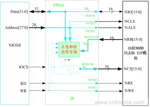 16位的NAND FLASH存儲器芯片可以有多種組合方式,可以用多個16位的NAND FLASH組合,也可以用多個8位的NAND FLASH組合。這里我們假設16位的SIP NAND FLASH產品是由多個16位的NAND FLASH組合而成,下面的IP核是根據它的結構來設計的。