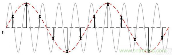當采樣過程不滿足Nyquist(奈奎斯特)采樣定理,就可以考慮使用另一種采集方法--等效采樣。等效采樣的基本原理是把高頻、快速信號變成低頻、慢速重復信號進行采集。為了達到低速采樣還原高頻信號的目的,要求被測信號一定是周期變化的,如果將每個采樣點安排在不同信號周期內,取自波形不同的位置上,而不是在同一個周期的話,就可以大大降低采樣頻率。最后通過數學方法再將多個周期內的采樣點還原到一個周期內,重構被測信號。
