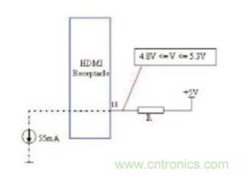 有些客戶利用一個串聯電阻或二極管來限制5V輸出的電流。在HDMI兼容性測試中,HDMI Tx的5V電源測試要求從+5V電源引腳吸取55mA電流。這可能引起測試失敗,因為電源輸出必須介于4.8V至5.3V之間才能通過。圖1顯示,當連接一個10Ω的電阻時,輸出降至4.45V,因此沒有通過測試。