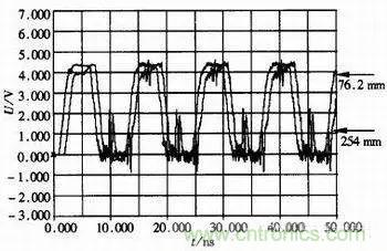在高速數(shù)字電路的設計中,除了阻抗匹配外,部分器件對傳輸線的長度有著嚴格的要求,信號頻率越高,要求傳輸線的長度越短。以X1器件和X2器件為例建立仿真模型如圖3所示。在仿真模型中加了33Ω的匹配電阻,選擇仿真信號頻率為66MHz方波,改變傳輸線長度分別為76.2mm和254mm時進行仿真。仿真結果如圖4所示。