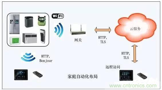 從上圖可看出,家庭自動化系統將嵌入式微控制器技術、無線連接、接入網絡融合為一體。Apps軟件能夠使用戶發現家里的設備,予以設置,或者創建一個動作加以控制。