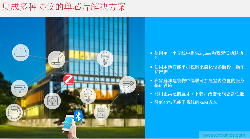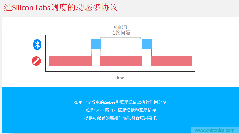 Silicon Labs在芯片設計時,就提出了動態多協議的做法。即:在單一無線電的Zigbee和藍牙通信上執行時間分隔,支持Zigbee路由、藍牙連接和藍牙信標。為工程師提供可配置的連接間隔,以符合應用要求。陳雄基表示,目前這種做法據他所知Silicon Labs是業界唯一已經在技術上實現的公司。