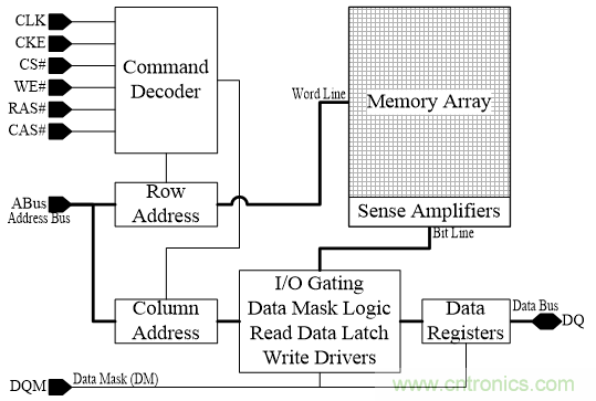圖1顯示SDRAM的簡要功能方塊圖,行地址選通信號(CAS#)是根據(jù)預(yù)充電而設(shè)計(jì)的延遲控制信號,亦即無預(yù)充電則不必分時控制列地址選通信號(RAS#)、CAS#。差動頻率信號(CLK, CKE)的頻率是基于微處理器的工作頻率,數(shù)據(jù)屏蔽信號(DQM)對應(yīng)差動頻率信號的邊緣;這些信號用于進(jìn)行同步傳輸操作。對于感測放大器以及寫入驅(qū)動器的配置規(guī)劃,通常根據(jù)外部數(shù)據(jù)總線的位寬度而設(shè)計(jì)相同的數(shù)量,然而,可以導(dǎo)入并行存取的方法來增加存取效率,因此增加了行地址的位寬度以選擇同列不同行的感測放大器與寫入驅(qū)動器。這種方法產(chǎn)生了叢發(fā)模式(burst mode)以及同列存取,但并不會增加訪問速度,并且還要進(jìn)行同步傳輸操作,所以需要數(shù)據(jù)緩存器。