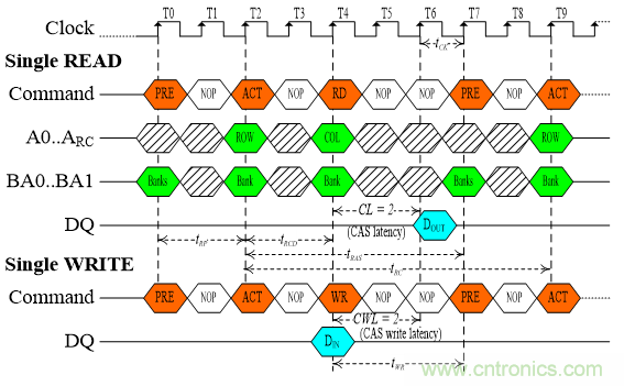 圖中,頻率時間(tCK)是從此次頻率邊緣至下次頻率邊緣為止的時間。列地址選通預(yù)充電時間(tRP)是從PRE命令至ACT命令為止的時間。列地址選通至行地址選通延遲(tRCD)是從ACT命令至RD命令或WR命令為止的時間。行地址選通潛伏(CL)是從RD命令開始等候一段時間,并且以tCK為基本單位,然后乘上倍數(shù)。寫入時間(tWR)是從WR命令至PRE命令為止的時間;另外還可以tCK為基本單位,然后乘上倍數(shù),如同行地址選通潛伏的計(jì)時方法,因此命名為行地址選通寫入潛伏(CWL)。列地址選通時間(tRAS)是從ACT命令至PRE命令為止的時間。更新命令時期(tRC)是從這次ACT命令至下次ACT命令為止的時間。