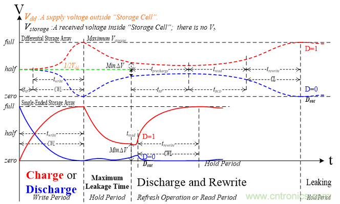 如果說3T DRAM是第一代DRAM技術(shù),使用差動放大器實(shí)現(xiàn)讀取功能的1T DRAM是第二代DRAM,那么在本文中的第三代DRAM技術(shù)是指取代差動放大器且大幅提升讀取功能的存取技術(shù)。1T DRAM的內(nèi)存基本單位是由一晶體管和一電容器所組成的儲存單元,又稱為1T DRAM單元。圖3顯示在單一儲存單元上進(jìn)行存取操作的波形,上半部分是使用差動放大器的第二代技術(shù),下半部分是第三代技術(shù),此圖主要用于比較這二者完成讀取操作所需花費(fèi)的最長時間。當(dāng)這一電容器的儲存電壓(Vstorage)放電達(dá)到最小差異電壓(Min. ?V)時就必須立即進(jìn)行更新操作(即讀取),所以此圖呈現(xiàn)有關(guān)讀取操作的最長時間就等于是更新操作的最長時間。圖中標(biāo)示有tprecharge、tread、trewrite、twrite,這些技術(shù)用語依序?qū)?yīng)產(chǎn)品規(guī)格的tRP、tRCD、CL與CWL。第三代技術(shù)無需tRP,除此之外,tRCD也很短暫且可由CWL替換CL,因此訪問速度接近SRAM,存取效率低于SRAM。