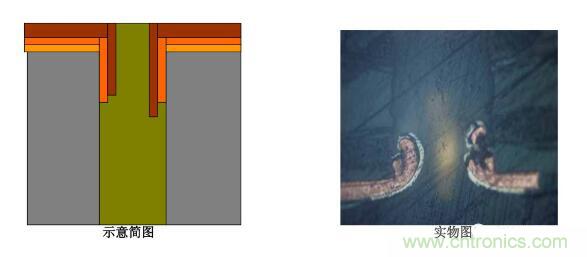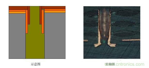 5.圖電孔無銅:斷口處圖電層未將板電層包住―――圖電層與板電層厚度均勻,斷口處齊斷;圖電層呈拉尖趨勢直至消失,板電層超過圖電層繼續(xù)延伸一段距離再行斷開。