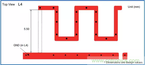 曲流型天線的長度比較難確定。長度一般比四分之一波長稍長,其長度由其幾何拓撲空間及敷地區(qū)決定。曲流型天線一般是PCB封裝,即板載天線。和倒F型一樣,天線一般放置在PCB頂層,鋪地一般放在頂層并位于天線附近,但天線周圍務(wù)必不能放置地,周圍應(yīng)是凈空區(qū)。如圖2,圖3: