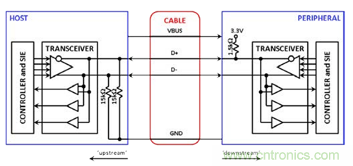 2. 它必須管理USB電纜上的雙向通信,確保其收發(fā)器在適當?shù)臅r候進行發(fā)送和接收,并精確重現(xiàn)所有驅動和空閑狀態(tài)。若要精確重現(xiàn)空閑狀態(tài),它必須在其上游側配置上拉電阻,以模擬連接下游外設的上拉電阻狀態(tài)。它在下游側也需配置下拉電阻。必須監(jiān)控總線上表示總線空閑、分組開始和分組結束的信號,以便正確響應這些狀況。