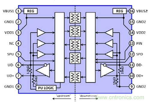 ADI的ADuM4160 USB數(shù)字隔離器2滿足全部要求,采用16引腳SOIC封裝。原理框圖如圖3所示。它包含一對USB收發(fā)器、5個基于iCoupler®的數(shù)字隔離通道、控制邏輯以及2個“智能調節(jié)器”。它還集成1.5 kΩ上游上拉電阻,以及15 kΩ下游下拉電阻。