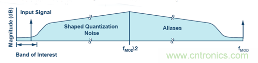 一般而言,對(duì)于特定的目標(biāo)頻段,每 2 個(gè)過(guò)采樣系數(shù)就會(huì)使動(dòng)態(tài)范圍改善 3 dB(假定為白噪聲頻譜)。Σ-Δ 型轉(zhuǎn)換器的第二個(gè)優(yōu)勢(shì)是噪聲傳遞函數(shù)。它將噪聲整形至更高頻率(如圖 2 所示),進(jìn)一步降低了目標(biāo)頻段內(nèi)的量化噪聲。