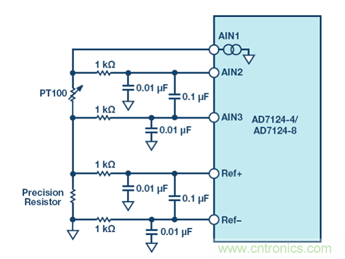 使容性 PGA 性能與阻性 PGA 相當(dāng)?shù)目尚修k法是以更高的電源電壓對(duì)電橋供電。比如,以±3.3 V 雙極性電源對(duì)電橋供電,從而增加應(yīng)變計(jì)的靈敏度,但代價(jià)是更高的系統(tǒng)復(fù)雜性和功耗。可能會(huì)得益于容性 PGA 的另一個(gè)例子是采用電阻式溫度檢測(cè)器(RTD)或熱電偶的溫度測(cè)量應(yīng)用。常用 RTD 電阻(比如 PT100)可以用來(lái)直接檢測(cè)溫度,或間接檢測(cè)熱電偶的冷結(jié),如圖 9 所示。