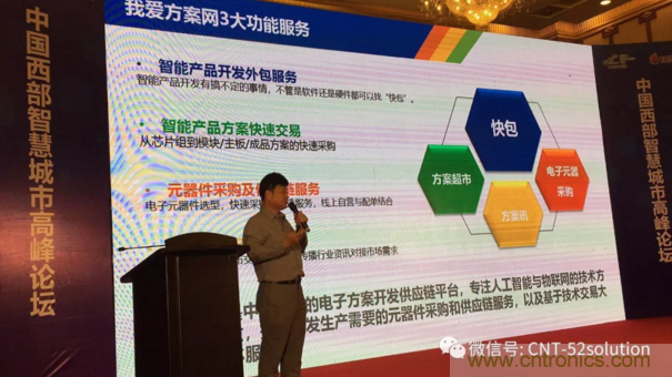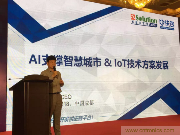 為服務西部產業創新,中電網絡技術/我愛方案網攜手四川本地技術服務商與中國電子信息博覽會來到成都,我愛方案網的CEO劉杰博士在2018中國智慧城市高峰論壇做大會報告,圍繞“AI支撐智慧城市和IoT技術方案發展”做了主題講演,分別介紹了AI發展路徑;通過大數據分析AI應用市場需求市場;解讀了AI處理器推動邊緣計算;列舉了大量AI物聯網方案開發案例,引起論壇參會人員的深度思考。