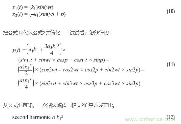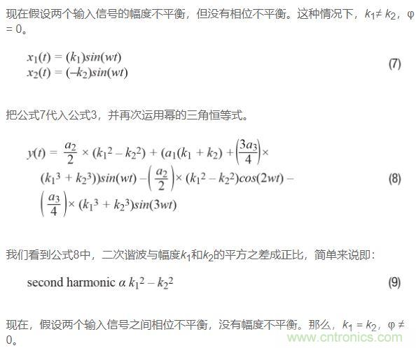 如果回過頭比較公式9和公式12,并且假設(shè)三角恒等式運(yùn)用正確,那么可以得出如下結(jié)論:二次諧波受相位不平衡影響比受幅度不平衡影響更嚴(yán)重。原因如下:對(duì)于相位不平衡,二次諧波與k1的平方成正比;再看公式12,對(duì)于幅度不平衡,二次諧波與k1和k2的平方差成正比,或看公式9。由于k1和k2大致相等,因此這種差異通常很小,特別是如果將其與平方數(shù)進(jìn)行比較!