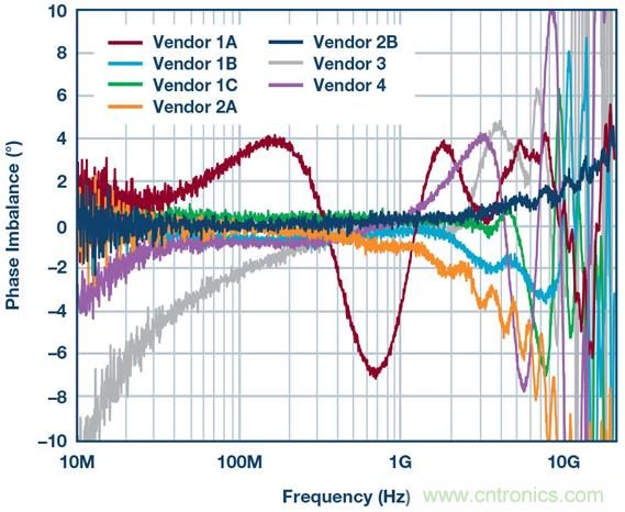 圖3揭示的HD2失真曲線方差量證明,需要進(jìn)一步考察巴倫的性能,特別是相位和幅度不平衡。以下兩幅圖顯示了不同制造商的幾款巴倫的相位和幅度不平衡。使用網(wǎng)絡(luò)分析儀來測(cè)量不平衡。