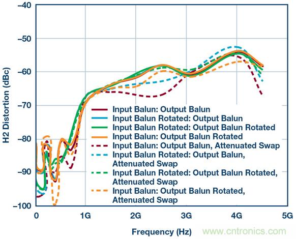 乍一看相當(dāng)簡(jiǎn)單,但魔鬼隱藏在細(xì)節(jié)中。圖3顯示了一組HD2測(cè)試結(jié)果,其系使用本框圖中的所有器件、差分放大器、巴倫、衰減器等得到的。這些測(cè)試證明:僅僅用不同方式翻轉(zhuǎn)巴倫方向所導(dǎo)致的細(xì)微相位不匹配,便能在HD2掃頻中產(chǎn)生不同結(jié)果。此設(shè)置中有兩個(gè)巴倫,因此通過顛倒設(shè)置一側(cè)或兩側(cè)的連接可以創(chuàng)建四種可能的場(chǎng)景。結(jié)果如圖3所示。
