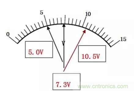 表盤的最小分度值為0.5V/格,雖能準確讀到0.5V,但誤差仍出現在最小分度值的同一數位上,即以V為單位的十分位。其估讀法則是:將最小分度分為五等分,即為0.1V。